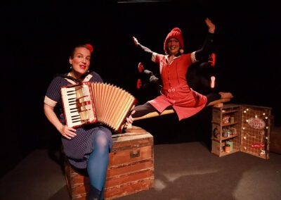 Elles sont munies de 3 malles de voyage, qui dévoilent à l’intérieur un véritable stand de bobines, de petites boîtes, de fioles. Dans ce décor sensoriel, chaque flacon, chaque ruban rapporte de leur grande épopée une histoire, une chanson d’une contrée lointaine, un conte d’hiver, une acrobatie de Noël…